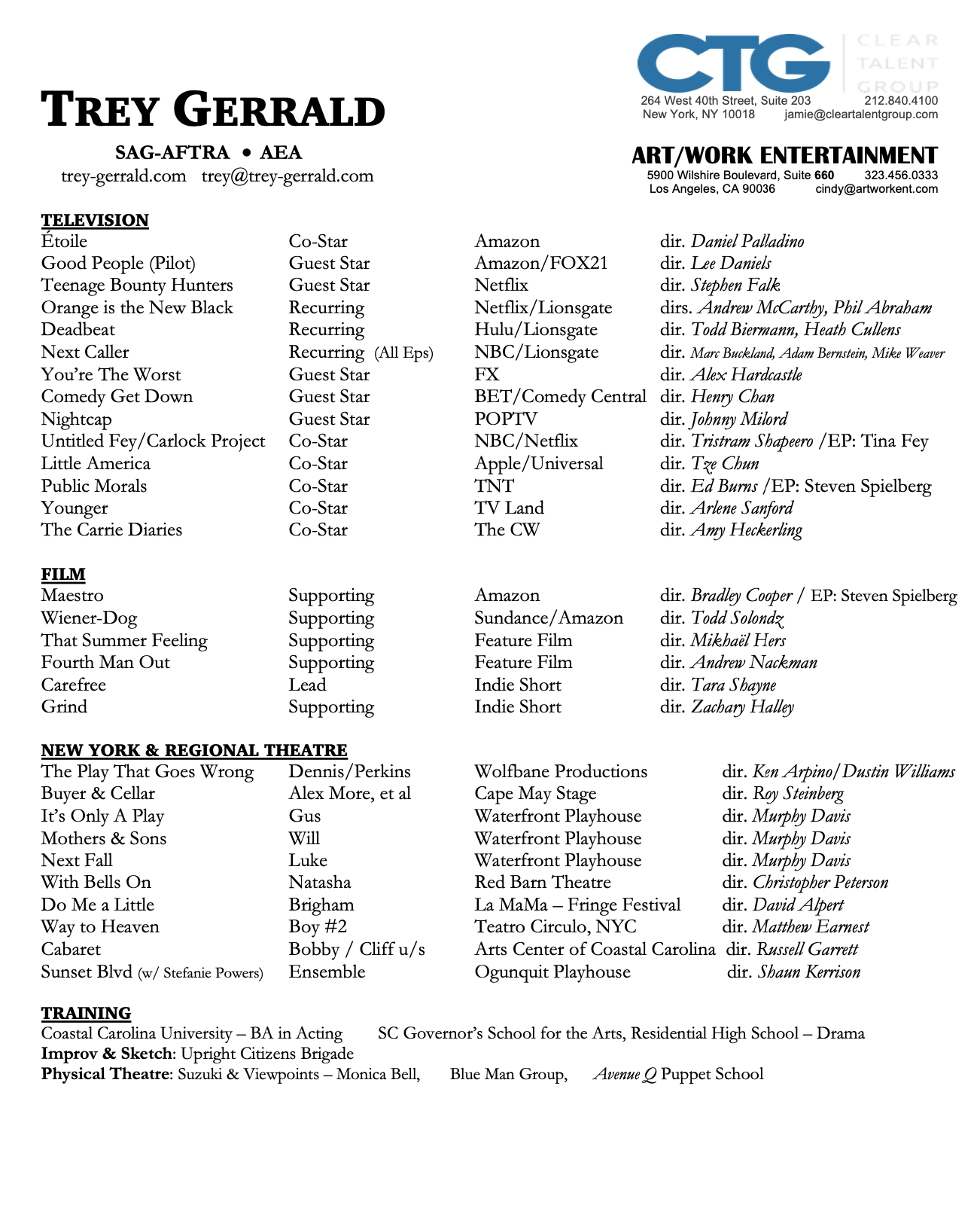Bouncing between New York City and Los Angeles, Trey is a proud member of both professional actor unions Actor's Equity Association and Screen Actors Guild ‐ American Federation of Television and Radio Artists. He holds a Bachelor of Arts in Acting from Coastal Carolina University where he received 6 Irene Ryan Acting Nominations in 4 years from the Kennedy Center's prestigious KCACTF.